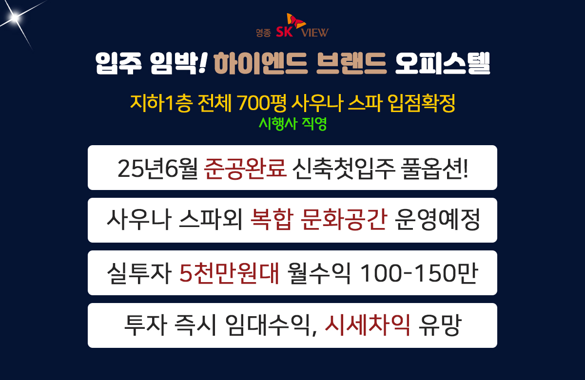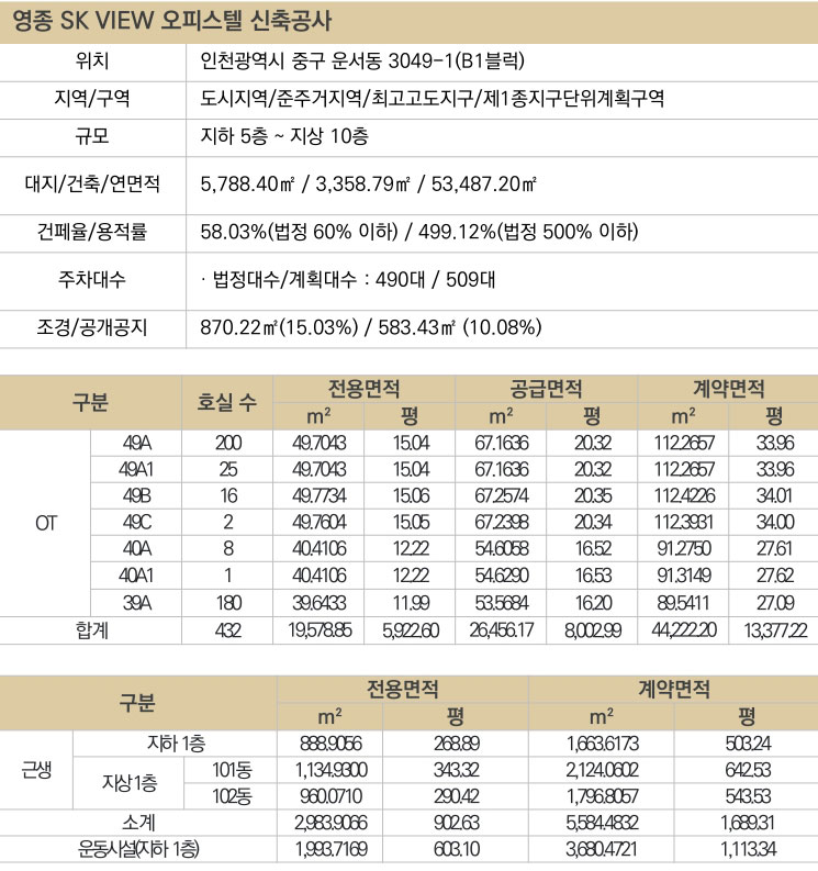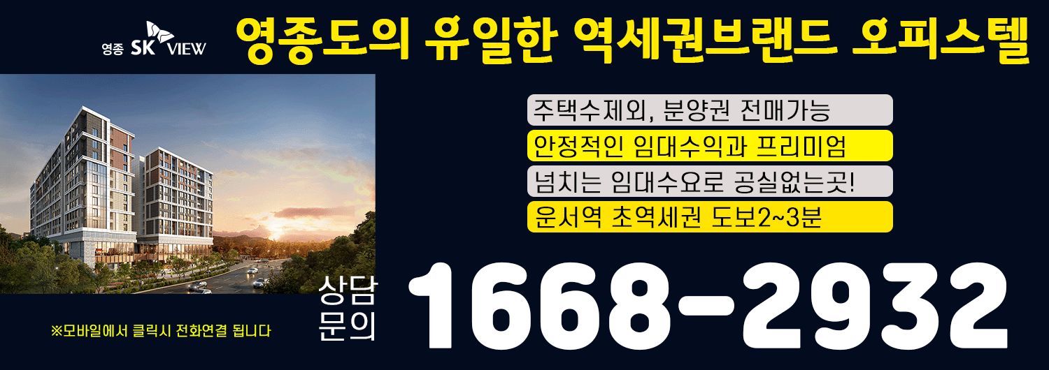 임대수요가 넘치는 운서역· 역세권 오피스텔! 영종sk뷰 운서역 관심고객등록 2년전 가격 그대로 파격분양!☆완공임박 · 조경도 명품☆ ◈트리플 역세권 프리미엄◈ 운서역 일대 희소성있는 평형 영종하늘도시·영종둘레길등공세권의 쾌적한 주거환경! 넘치는 수요로 공실걱정 NO ◈회사보유분 선착순 계약중◈ 공사중 건물 내외부 모습 | 사업개요 | 입지환경 | 동·호안내 | 설계특장점 | 세대안내 | 프리미엄 영종도에서 희소성 있는1.5, 2ROOM 관심고객등록 이 양식을 작성하려면 브라우저에서 JavaScript를 활성화하십시오.성함 *전화번호 *개인정보수집동의 *체크제출 개인정보 수집및 이용약관 1.”영종sk뷰 운서역”은 고객님들에게 필요한 정보를 빠르게 제공하고자 최소한의 개인정보인 이름,연락처를 등록하고 있습니다.2.수집한 개인정보는 분양정보및 분양상담등 안내를 위해 제공 받고 이용목적이 달성된 후에는 해당정보를 지체없이 파기합니다.